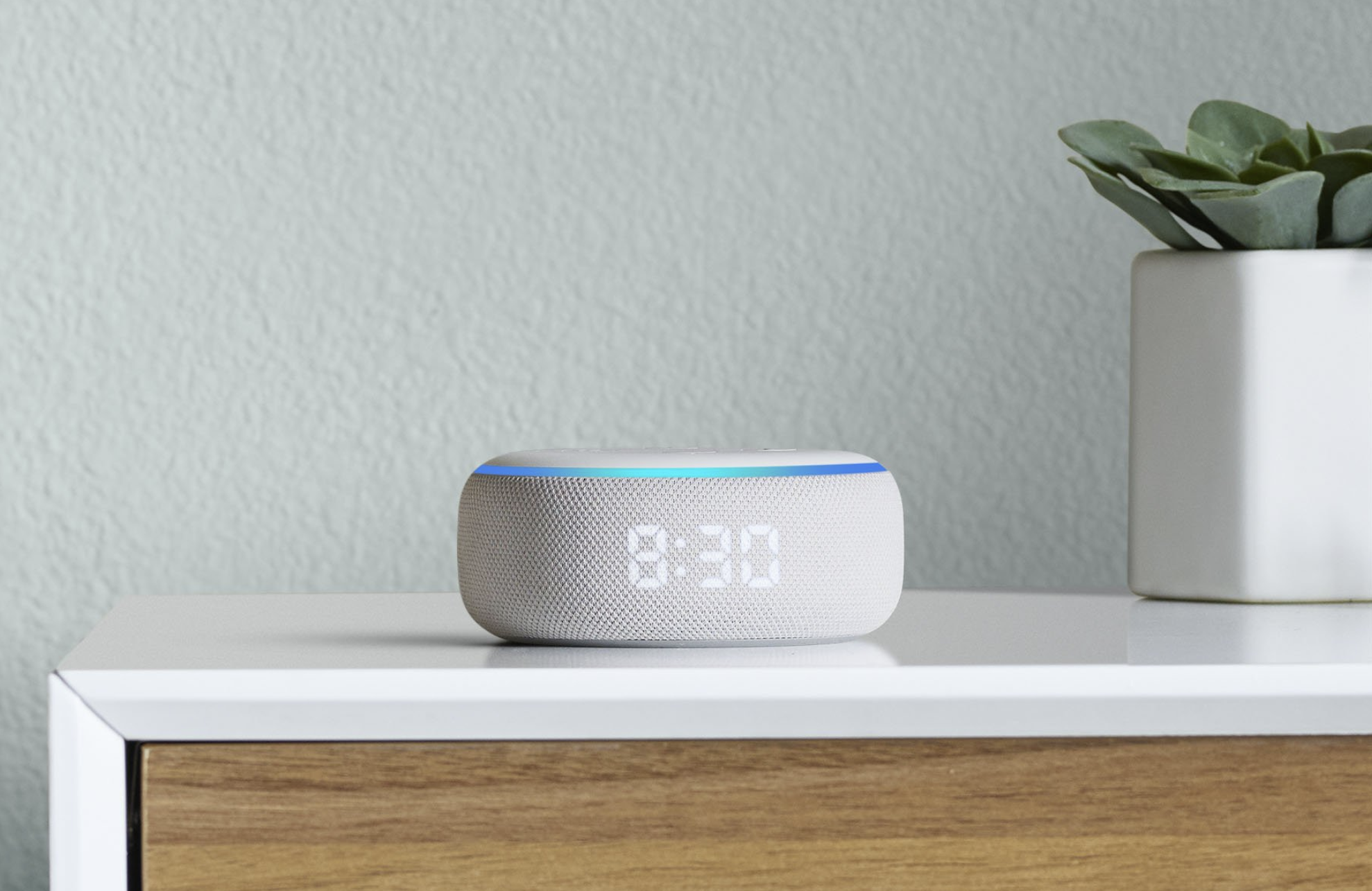 Echo Dot with clock starts with the best-selling Echo device ever, and adds a simple, bright LED display that makes it the perfect addition to a bedside table or countertop. The LED display automatically adjusts based on the brightness of the room, so you can easily see the time, just ask to see the outdoor temperature, or to set a morning alarm or pasta timer. Plus, you can tap the top of the device to conveniently snooze an alarm.